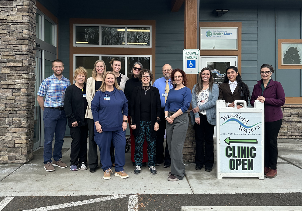 Group of people outside Winding Waters smiling into the camera next to a "Clinic Open" sign