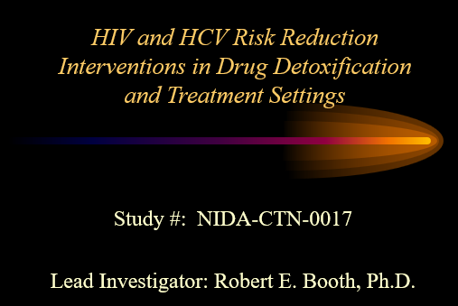 This presentation describes CTN protocol 0017, “HIV and HCV Interventions in Drug Treatment Settings.” This study tests two strategies to reduce the risk of contracting HIV or HCV by reducing risk behaviors in patients undergoing drug detoxification. The first includes pretest counseling, testing, posttest counseling, and the provision of HIV/HCV results. The second strategy, called therapeutic alliance, provides clients with information to guide them through the process of role induction and aims to facilitate transition to continuing care for drug treatment.