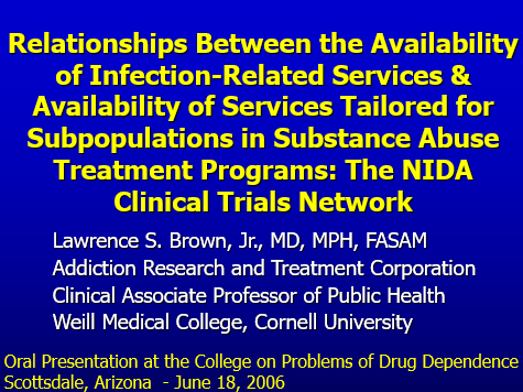 This presentation describes the process by which these surveys were created, distributed, and collected, and offers data demonstrating substantial variation in the availability of infection-related services in CTN treatment programs for special populations. These are preliminary results of a larger study that aims to fill the information gap about available services for infectious disease in substance abuse treatment programs, providing a basis for later studies on the efficiency of these services and of health outcomes.