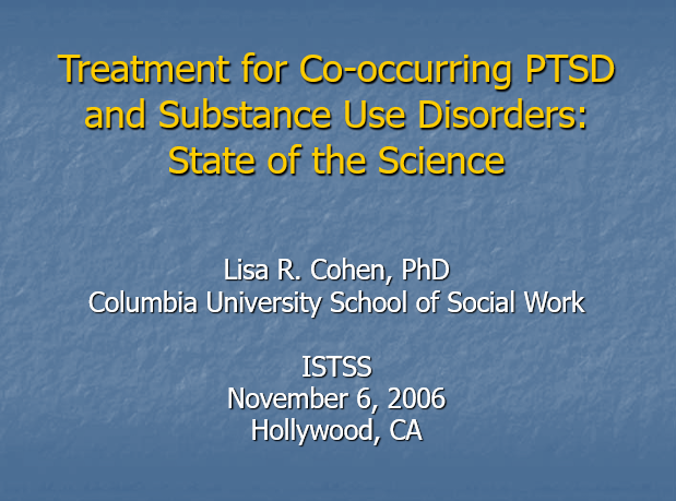 These three presentations all address issues of women with trauma/PTSD and substance use disorders, a topic currently being examined by protocol CTN-0015 (“Women’s Treatment for Trauma and Substance Use Disorders”). The first presentation, “Treatment for Co-occurring PTSD and Substance Use Disorders: State of the Science,” addresses clinical challenges in the treatment of traumatic stress and addiction. The second presentation, “Challenges to Implementing Trauma-focused Interventions in Substance Abuse Treatment Programs,” compares “trauma-informed treatment” with “trauma-specific treatment,” and provides suggestions on ways to encourage the implementation of trauma programs in substance abuse treatment settings.