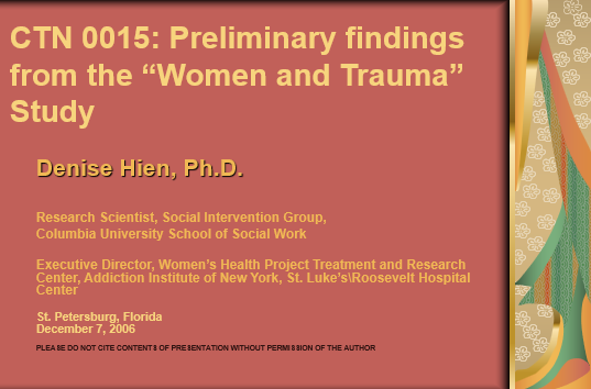 This presentation provides an overview of the research design, aims, and preliminary outcomes of National Drug Abuse Treatment Clinical Trials Network protocol CTN-0015 (“Women’s Treatment for Trauma and Substance Use Disorders.”).