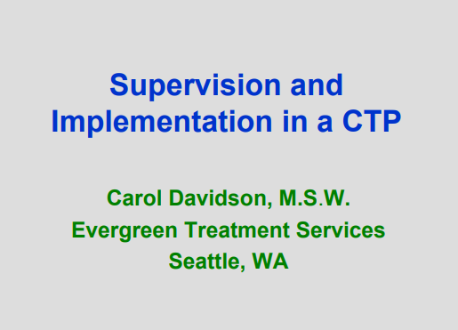 Evergreen Treatment Services, a CTP in the Washington Node, participated in protocols CTN-0018 and CTN-0019, (Reducing HIV/STD Risk Behaviors : A Research Study for Men/Women in Drug Abuse Treatment). This presentation describes the difference between the study intervention and the treatment-as-usual HIV-education program used at ETS before they became involved in the CTN. It offers information about the recruitment process, and then describes the experiences of everyone involved, including the patients, counselors, and supervisors. After participating in the two protocols, ETS has made a variety of changes to their HIV education program, retaining many, but not all, elements of the protocol’s program. Once study results are available, the agency is also considering utilizing the study’s five session, gender-specific intervention in existing agency groups and with higher-risk patients.