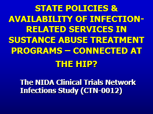 This presentation describes the design, objectives, procedures, and outcomes of one facet of protocol CTN-0012 (“Characteristics of Screening, Evaluation, and Treatment of HIV/AIDS, Hepatitis C Viral Infections, and Sexually Transmitted Infections in Substance Abuse Treatment Programs”). The protocol examined the associations between HIV/AIDS, hepatitis C (HCV), and sexually transmitted infection (STI)-related services provided by substance abuse treatment programs in the National Institute on Drug Abuse Clinical Trials Network (NIDA CTN), and the states within which they are located.
