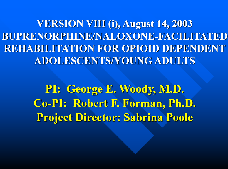 This presentation provides a rationale and baseline data for a study comparing two 3-month treatments for adolescents/young adults who are addicted to heroin. Both groups get 3 months of psychosocial treatment (individual and/or group drug counseling). In addition, one group, the experimental group, gets 3 months of buprenorphine stabilization. The control group is detoxified from opiates using buprenorphine over a 7 – 14 day period. The researchers believe the use of a 3-month stabilization with buprenorphine/naloxone in combination with psychosocial therapy will more effectively reduce heroin use, help these young people comply with their treatment, and improve their overall adjustment than brief detoxification with buprenorphine.