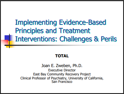 This session of the 2008 NIDA Blending Conference focused on evidence-based practices that involve psychosocial interventions. Dr. Zweben’s presentation, “Implementing Evidence-Based Principles and Treatment Interventions: Challenges & Perils,” provides an overview of the benefits of using evidence-based principles and practices, implementation issues, and dissemination mechanisms such as the NIDA National Drug Abuse Treatment Clinical Trials Network (CTN), the Addiction Technology Transfer Centers, and NREPP, SAMHSA’s registry of effective programs and practices.