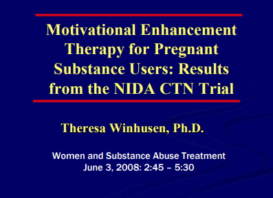 This presentation describes protocol CTN-0013, “Motivational Enhancement Therapy to Improve Treatment Utilization and Outcome in Pregnant Substance Users,” which aimed to improve treatment retention for pregnant substance users. Two hundred pregnant substance users entering outpatient substance abuse treatment at one of the four participating CTPs (community treatment programs) were randomized to receive either three individual sessions of Motivational Enhancement Therapy for pregnant substance users (MET-PS) or the first three individual sessions normally provided by the program.