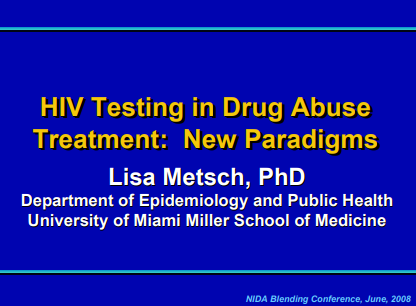 This presentation begins with an update on revised CDC guidelines for HIV screening in health care settings, and describes the benefits of HIV testing and counseling in general. It then presents information about the latest technologies being used to conduct HIV testing and counseling, including the HIV rapid test, which uses blood from a simple finger stick and provides results in 20 minutes. The presentation then goes on to introduce one of the newest National Drug Abuse Treatment Clinical Trials Network protocols, CTN-0032, “HIV Rapid Testing and Counseling,” which seeks to evaluate the most effective strategy to ensure that persons in drug abuse treatment programs are tested for HIV and receive their HIV test results. Project investigators aim to begin randomizing participants for CTN-0032 in Fall, 2008.