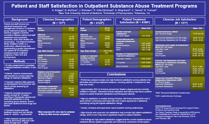 Patient and staff turnover are significant therapeutic and management concerns in substance abuse treatment programs. Some literature suggest a positive correlation between patient satisfaction and successful outcome, while other studies are inconclusive. The treatment environment (location, physical space, and cultural milieu) is also associated with successful outcomes. Although providers often represent that they are satisfied with their jobs this seems to be contradicted by high staff turnover. Initiated in 2006 and based on completed CTN protocol CTN-0016 (“Patient Feedback : A Performance Improvement Study in Outpatient Addiction Treatment Settings”), the Patient Feedback study is a randomized, effectiveness trial, implementing a quality improvement (QI) system at 20 outpatient, substance abuse treatment programs. Patients’ baseline assessments were self-reported on survey instruments capturing ratings of treatment satisfaction. Clinic demographic forms and four self-report surveys assessing job satisfaction captured baseline data from providers along the following domains: 1) quality of director-employee relationships, 2) organizational characteristics, and 3) intrinsic/extrinsic satisfaction. Preliminary analysis from surveys of 679 patients reveals very high treatment satisfaction across patients of various treatment durations, including 227 patients in treatment for 1 month or less. Job satisfaction amongst 76 clinicians will be presented based on scores from the LMX-7 (evaluates interactions between directors and employees), the ORC (18 domains assessing organizational characteristics), and the MSQ (scale rating job satisfaction). Additional findings will be presented on gender, ethnicity, and length-of-treatment on patient and staff satisfaction. In conclusion, these findings have implications for the development and implementation of QI systems to enhance treatment outcomes and the work environment in substance abuse programs.