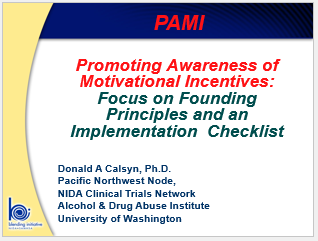 The presentation ends with a description of Nancy Petry’s checklist on motivational incentive implementation procedures, taken from her Drug and Alcohol Dependence article published in 2000. For a copy of that article, please contact the CTN Dissemination Librarians.