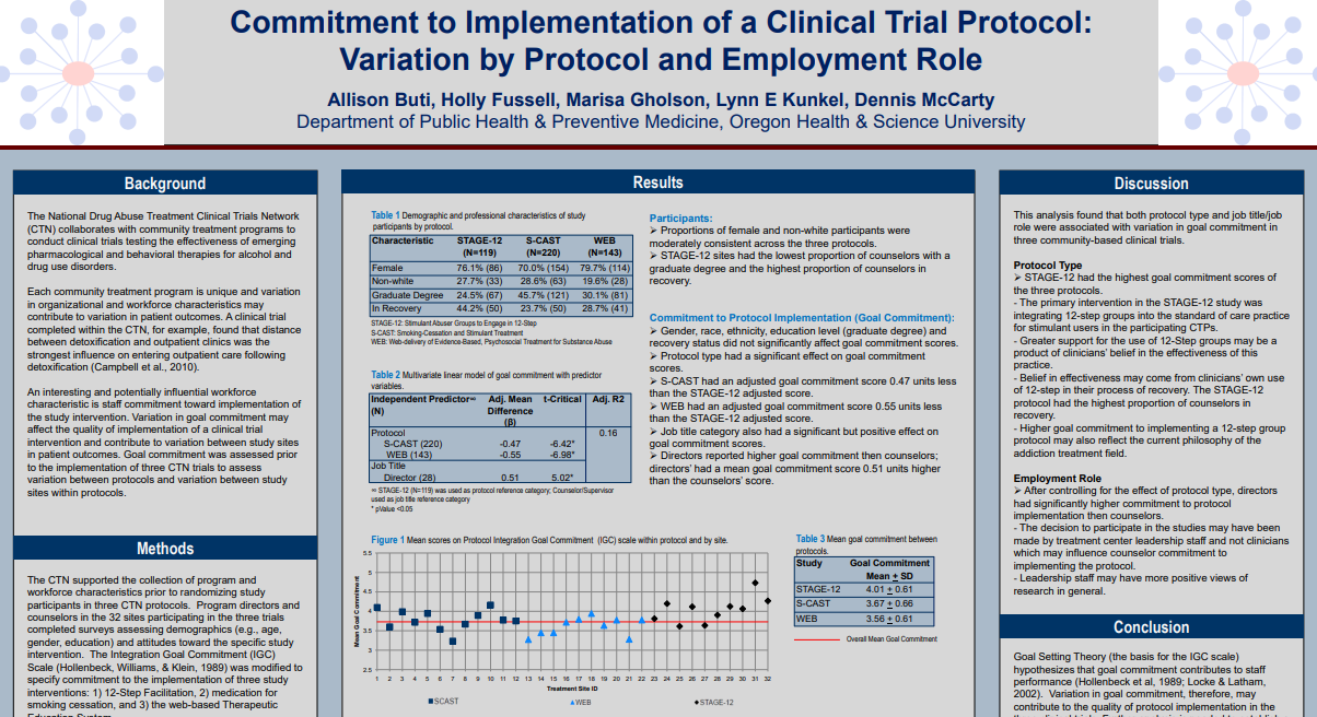 For this study, goal commitment was assessed prior to the implementation of three CTN trials (CTN-0031 (STAGE-12), CTN-0046 (S-CAST), and CTN-0044 (Web Delivery)) to assess variation between protocols and variation between study site within protocols. The analysis found that both protocol type and job title/job role were associated with variation in goal commitment in the three trials.