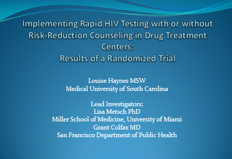 This presentation provides an overview of National Drug Abuse Treatment Clinical Trials Network protocol CTN-0032, which examined the efficacy of on-site rapid HIV testing with risk-reduction counseling in increasing receipt of HIV test results and reducing HIV risk behaviors among persons in drug treatment. The study demonstrated the value of on-site rapid HIV testing in drug treatment centers but found no additional benefit from HIV sexual risk-reduction counseling. A follow-up study examining the cost-effectiveness of on-site testing (CTN-0032-A-1) found that referral for off-site testing is less costly, but also less efficient — the study determined that on-site testing is cost-effective, in that cast, using the current US threshold of <$100,000/QALY. Because on-site risk reduction counseling did not reduce sexual risk behavior or increase acceptance of HIV testing, it was not found to be cost-effective.